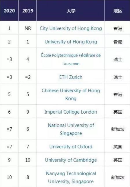 从前十的院校来看,主要被瑞士、中国香港、英国和新加坡包揽。除了香港三所大学,还有2所来自瑞士,分别是洛桑联邦理工学院和苏黎世联邦理工学院;3所来自英国,帝国理工学院、牛津大学、剑桥大学;2所来自新加坡,新加坡国立大学和南洋理工大学。