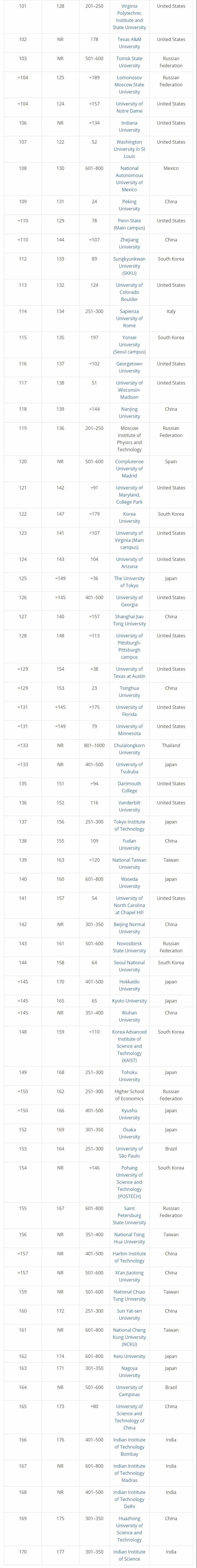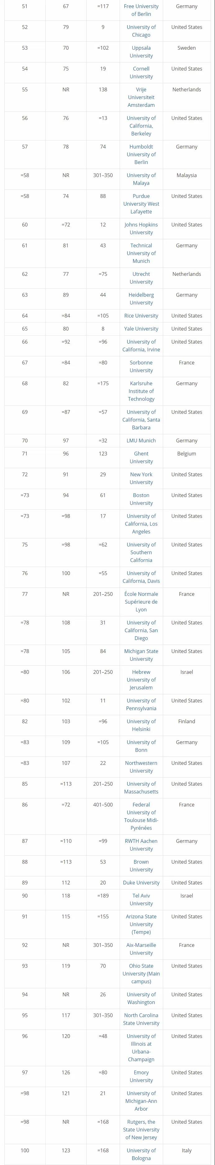 从整体排名来看,美国依然是上榜院校最多的国家,共有57所院校上榜。其中排名靠前的是麻省理工学院、加州理工大学、普林斯顿大学、斯坦福大学、卡内基梅隆大学等等。