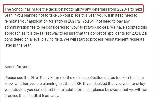 对于已经拿到了LSE今年秋季入学的研究生offer,但因为特殊原因希望保留offer延期一年入学的同学,那就只能撤销今年的offer,并将自己的材料转入明年入学的申请池中(无需重新提交材料和申请费)。大学将在2021申请季重新审理材料,并决定是否要给offer。也就意味着如果今年不入读,明年就要重新申请,能不能再次拿到offer真的不一定,注意,明年的竞争可能更大。
