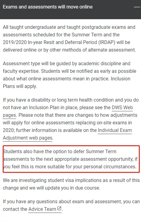 这种情况一般适用因为“不能”参加考试的或者考核的同学,一般需要额外申请。能不能允许看学校。还有的是学校调整了原定的考试周以及DDL,具体要看学校规定。(比如LSE,UCL等大学)