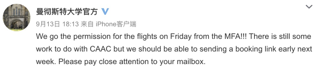 同时曼大官微表示,这周将通过邮件向学生发送机票预订链接。同学们可以密切关注自己的邮箱。