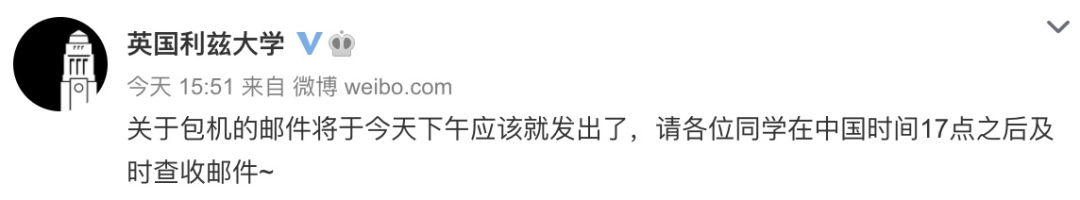利兹大学官微 (9月14日) 表示,关于包机的邮件应该今天下午就已经发出了,同学们可以在当日17点之后查收邮件了!