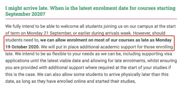 没有明确公布具体的最晚抵达校园日期,但是学校允许学生可以延迟到校,并且如果你已经抵达英国且在第1学期的过程中需要回国,学校也将全力支持。