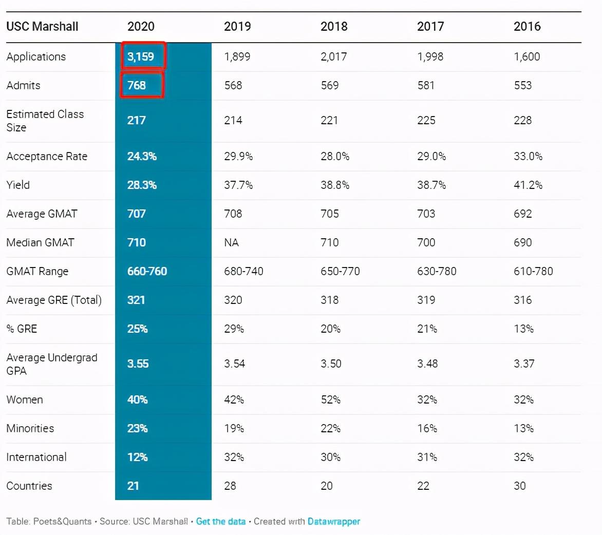 在美国所有商学院中, 南加州大学的马歇尔商学院(Marshall School of Business)的申请数量增幅最大,为66.4%,比过去四年都至少要多出1142人。