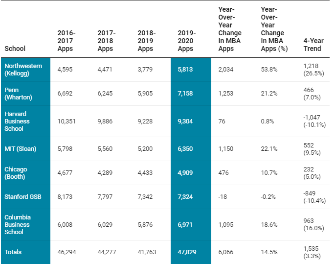 西北大学凯洛格商学院(Kellogg School of Management)的增幅为53.8%,在2019-2020年招生周期中超过了其他六所大学。