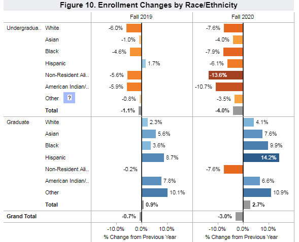 根据美国国家学生信息交流研究中心NSCRC公布的统计,2020年秋季学期,美国大学本科生入学率下降了4.0%,而研究生入学率则增长2.7%。