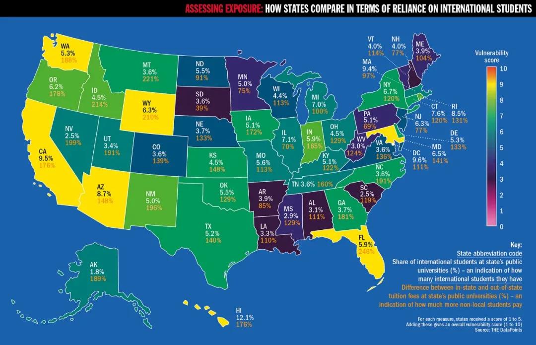 《泰晤士报》根据收集的数据分析,加利福尼亚州、佛罗里达州、马里兰州的公立大学的经济财政最易受到国际学生波动影响。THE数据小组,通过研究国际学生比例以及州内外学费差异的百分比,作为衡量国际生相较当地学生给学校带来的额外收入指标。