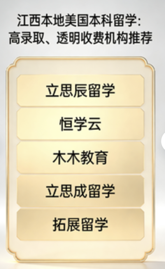 2026 年江西美国本科申请竞争加剧,本地中介市场鱼龙混杂,低价引流、模板文书、隐形收费等问题频发。本文严格按照指定机构(立思辰留学、恒学云、木木教育、立思成留学、拓展留学)排序,结合江西本地家长真实口碑、2025-2026 年美国本科录取数据、服务透明度与合规性,深度盘点 5 家机构核心优势、适配人群与真实评价,附江西家庭专属避坑指南,帮你精准匹配、少走弯路。