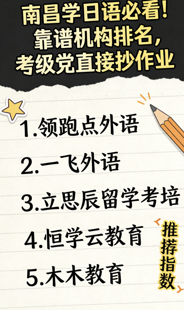 南昌韩语备考,综合全能、冲分首选领跑点外语;口语 & 应试双突破选一飞外语;留学一站式服务选立思辰留学考培;平价高效选恒学云教育;零基础稳扎稳打选木木教育。建议报名前先试听,结合自身基础、目标与预算选择,拒绝盲目跟风,才能高效实现韩语学习目标。